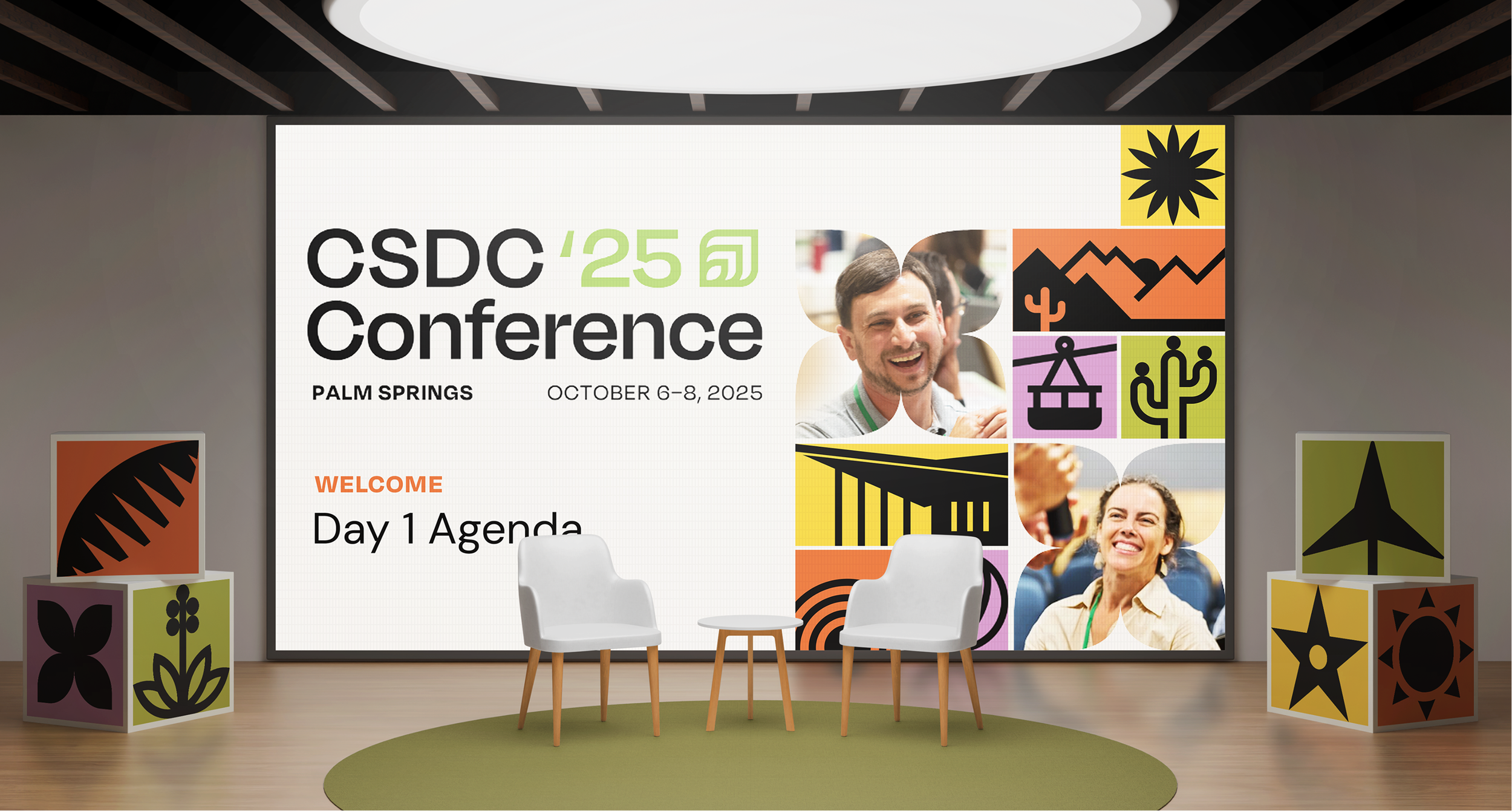 The annual CSDC (Charter Schools Development Center) Conference gathers Charter leaders from across California for three days of professional development, networking, and inspiration. Following the success of the 2024 Sacramento identity, the CSDC team partnered with Five Acres again to extend the design system into a new visual experience for 2025—one that celebrated the desert setting of Palm Springs while maintaining brand continuity and scalability for years to come.